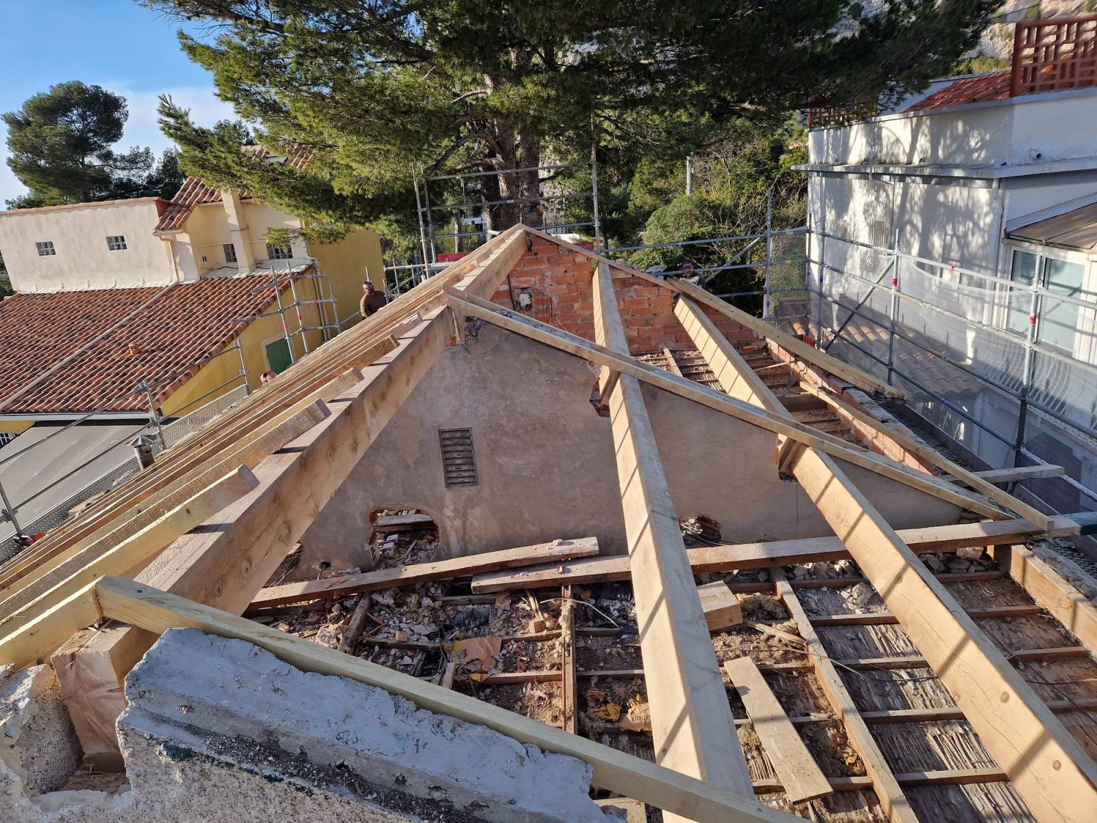 M Charpentes est intervenu avec tout le savoir faire ainsi que ses ouvriers qualifiés pour la réfection d'une ancienne toiture en bois et couverture en tuiles de terre cuite à Marseille.
